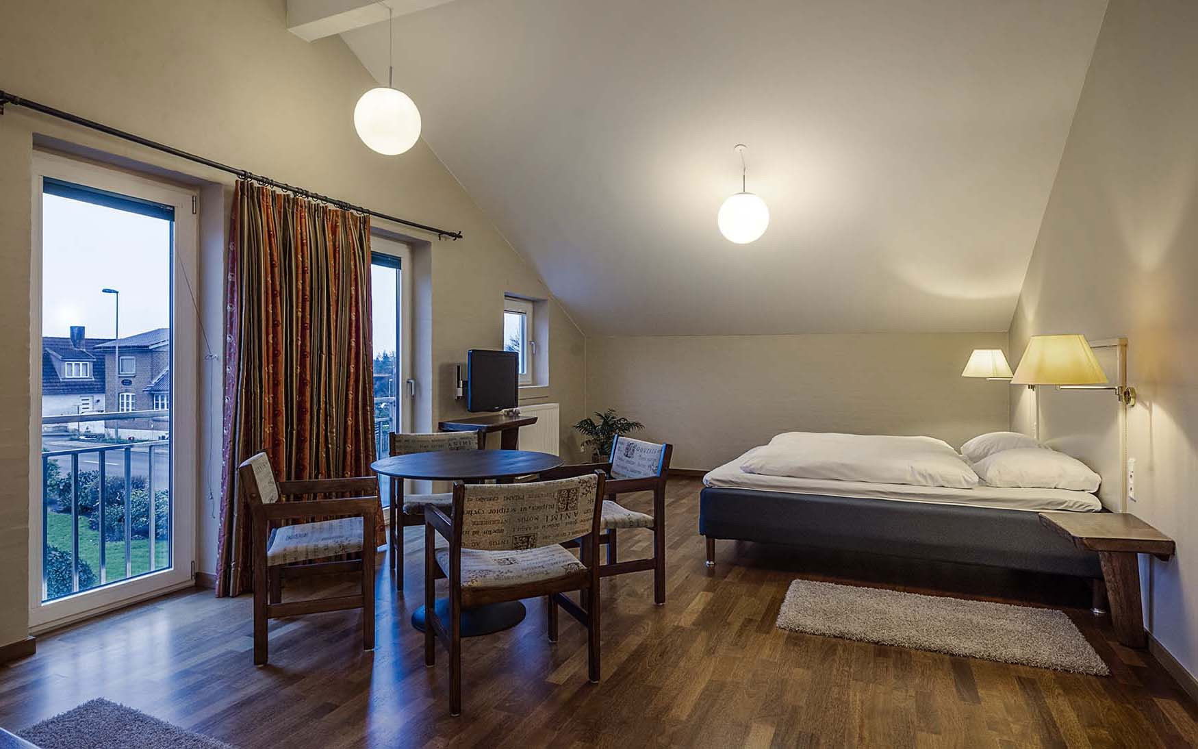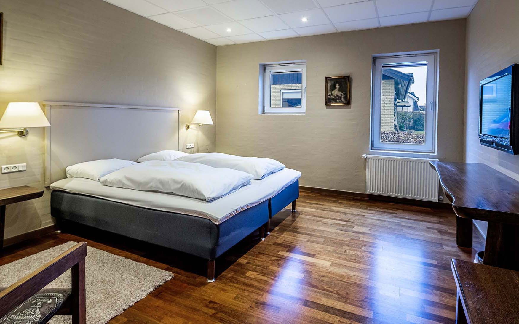 I bliver ved ankomst indlogeret på et af de 16 charmerende dobbeltværelser. Værelserne er fordelt i to bygninger med 8 værelser i hver og ligger på hver side af selve hovedbygningen, hvor Fru Larsens fine dining restaurant, selskabslokaler samt køkken er. Alle værelser er individuelt indrettede med en behagelig dobbeltseng, et afslappende siddeområde og faciliteter som tv, minikøleskab, hårtørrer på badeværelset og ekstra puder, der alt sammen bidrager til, at I får et godt ophold.