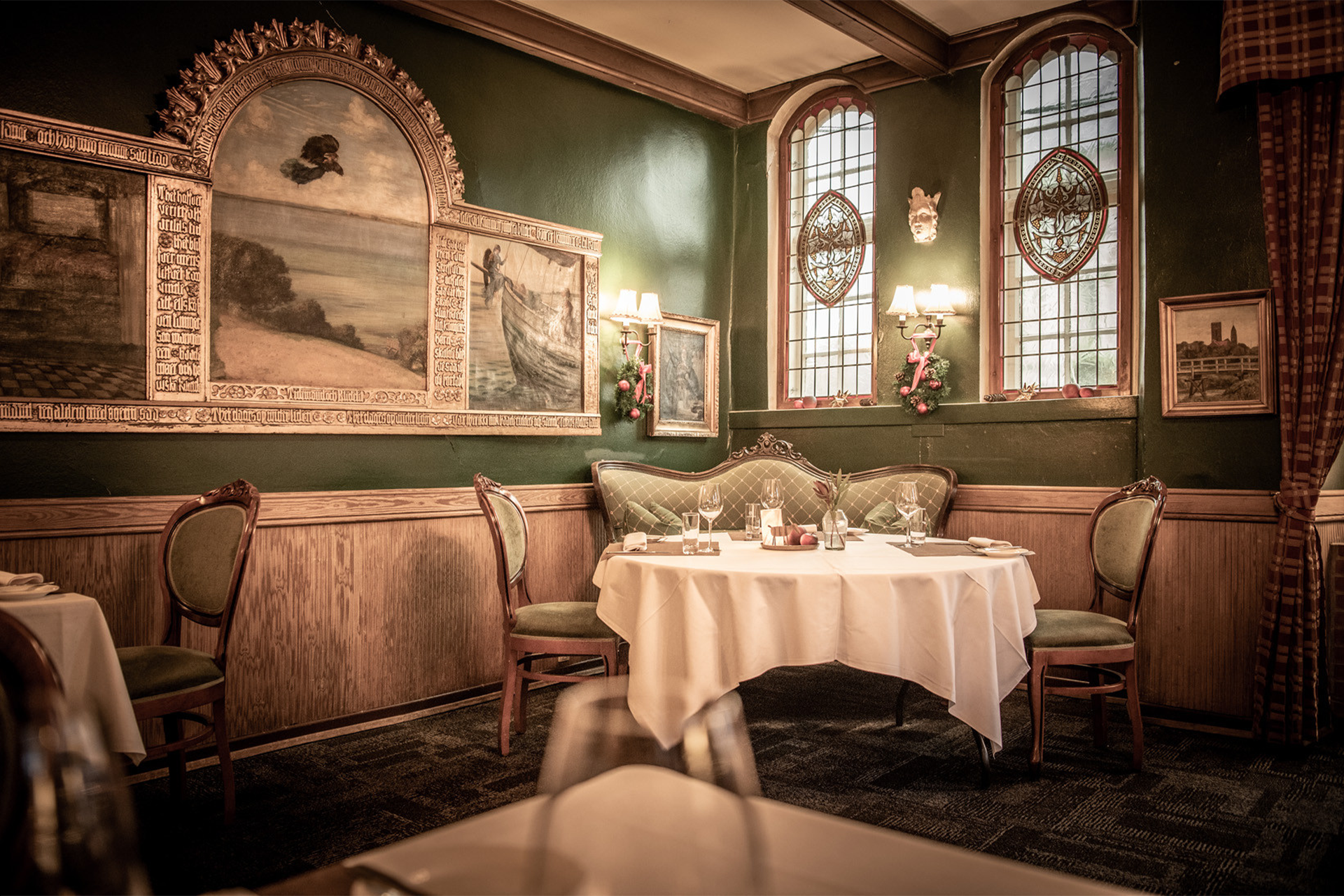 Charmerende lokaler i original historisk stil er sammen med dygtige og opmærksomme tjenere med til at gøre din aften til en oplevelse, hvad enten det drejer sig om en romantisk gourmetmiddag for to i Restaurant Dagmar, en hyggelig aften i Vægterkælderen, en rund fødselsdag eller et smukt bryllup.