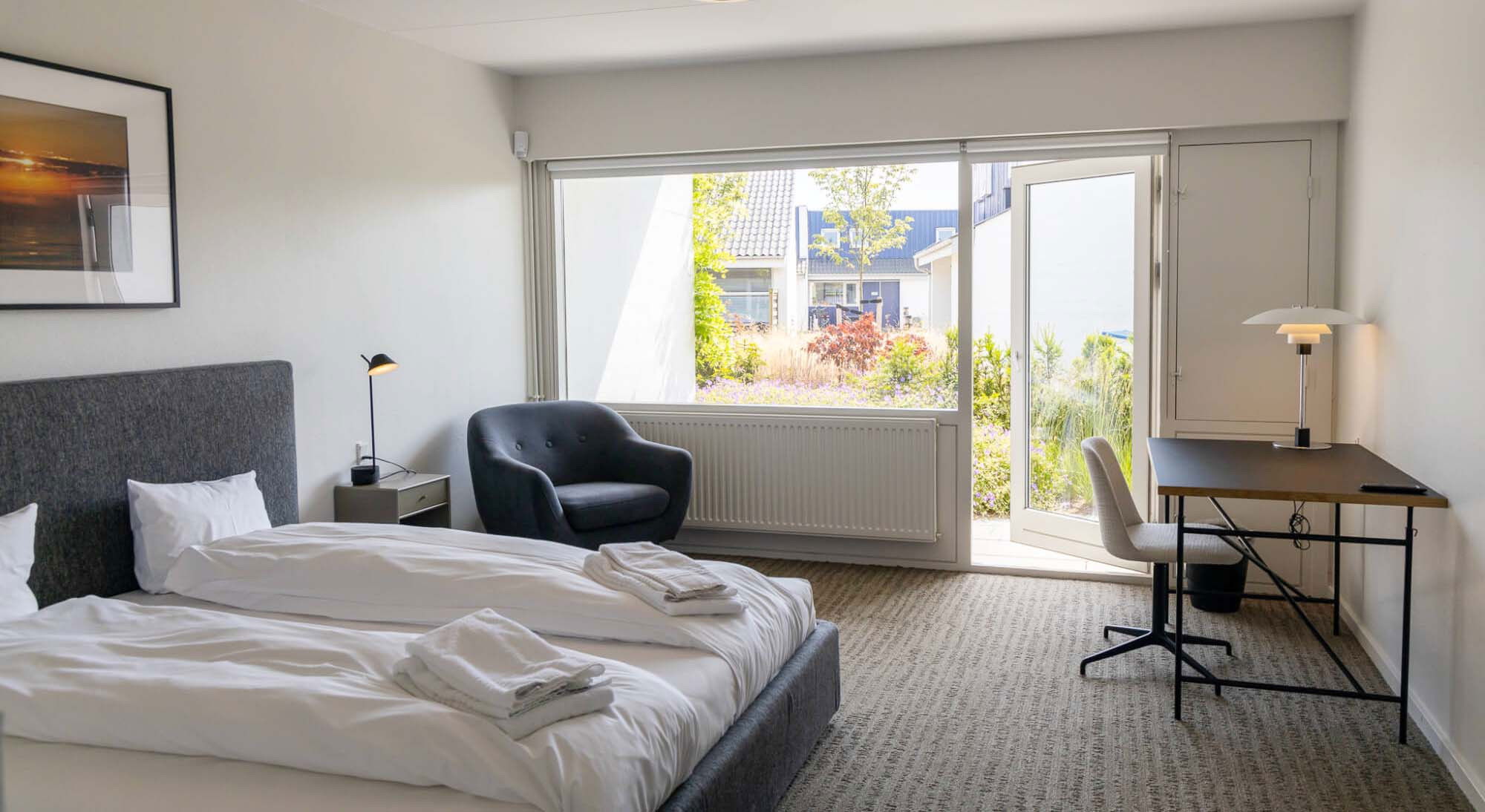 Værelserne på Hotel Nørrevang er indrettet i en rustik, moderne stil, der afspejler hotellets rødder, og dobbeltsengene er redt op med allergivenligt sengetøj. På værelset finder I fladskærms-tv, gratis wi-fi og eget badeværelse, hvor alt er på plads, så I næppe kommer til at mangle noget under jeres ophold.