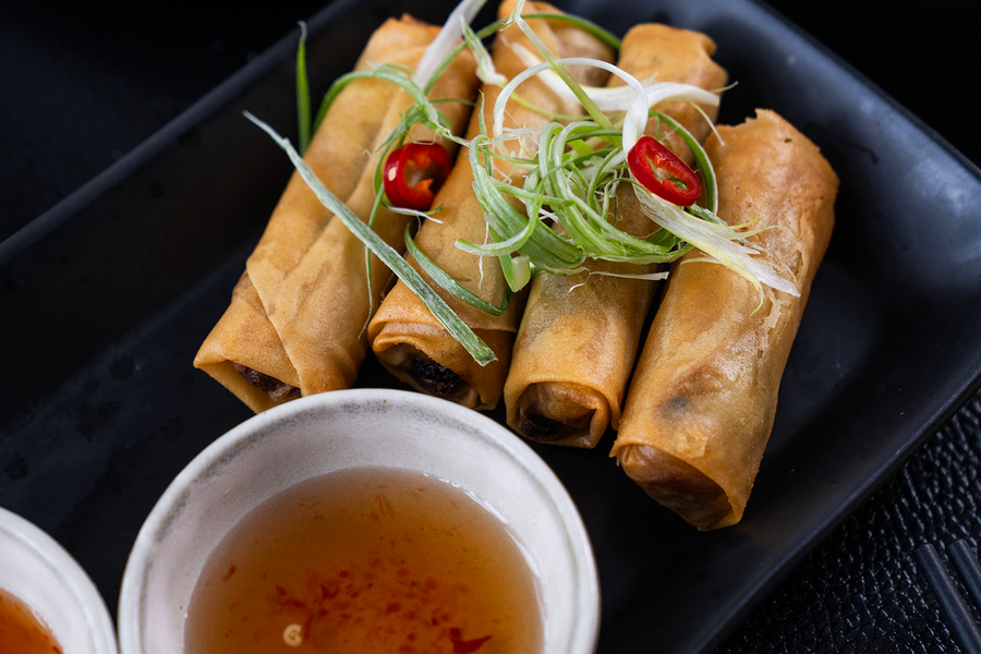 Forårsrulle med sød kartoffel, glasnudler og svampe. Serveres med fiskesauce-dressing.