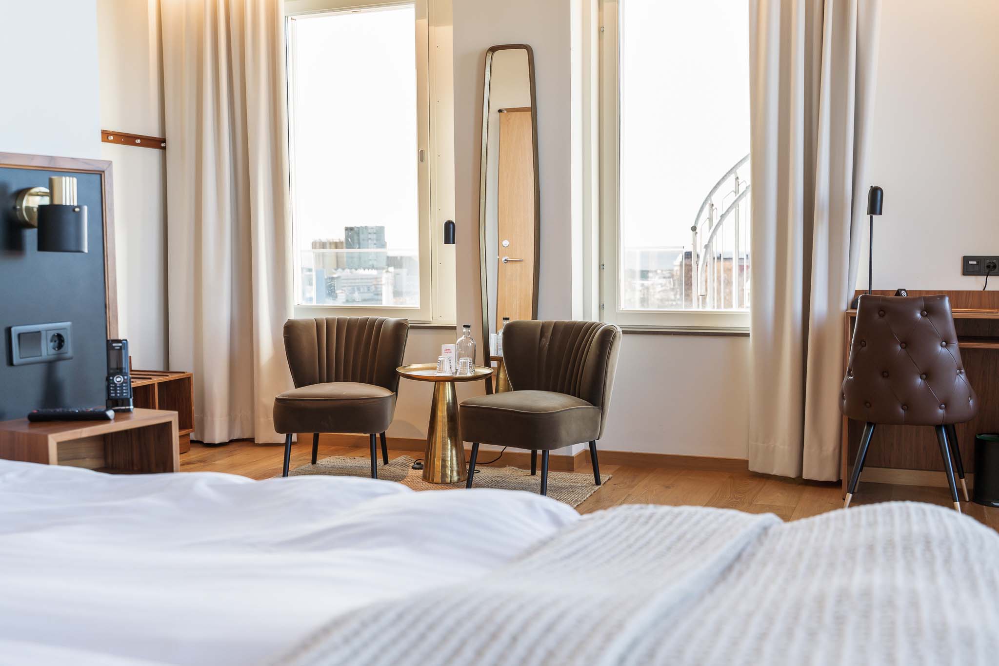 I kommer til at bo på et 17-19 m2, lydisoleret dobbeltværelse, der er moderne indrettet med sans for detaljer. Værelset er udstyret med en 160-180 cm bred seng, tv, arbejdsområde og en lænestol samt et badeværelse med eksklusive produkter og hårtørrer.