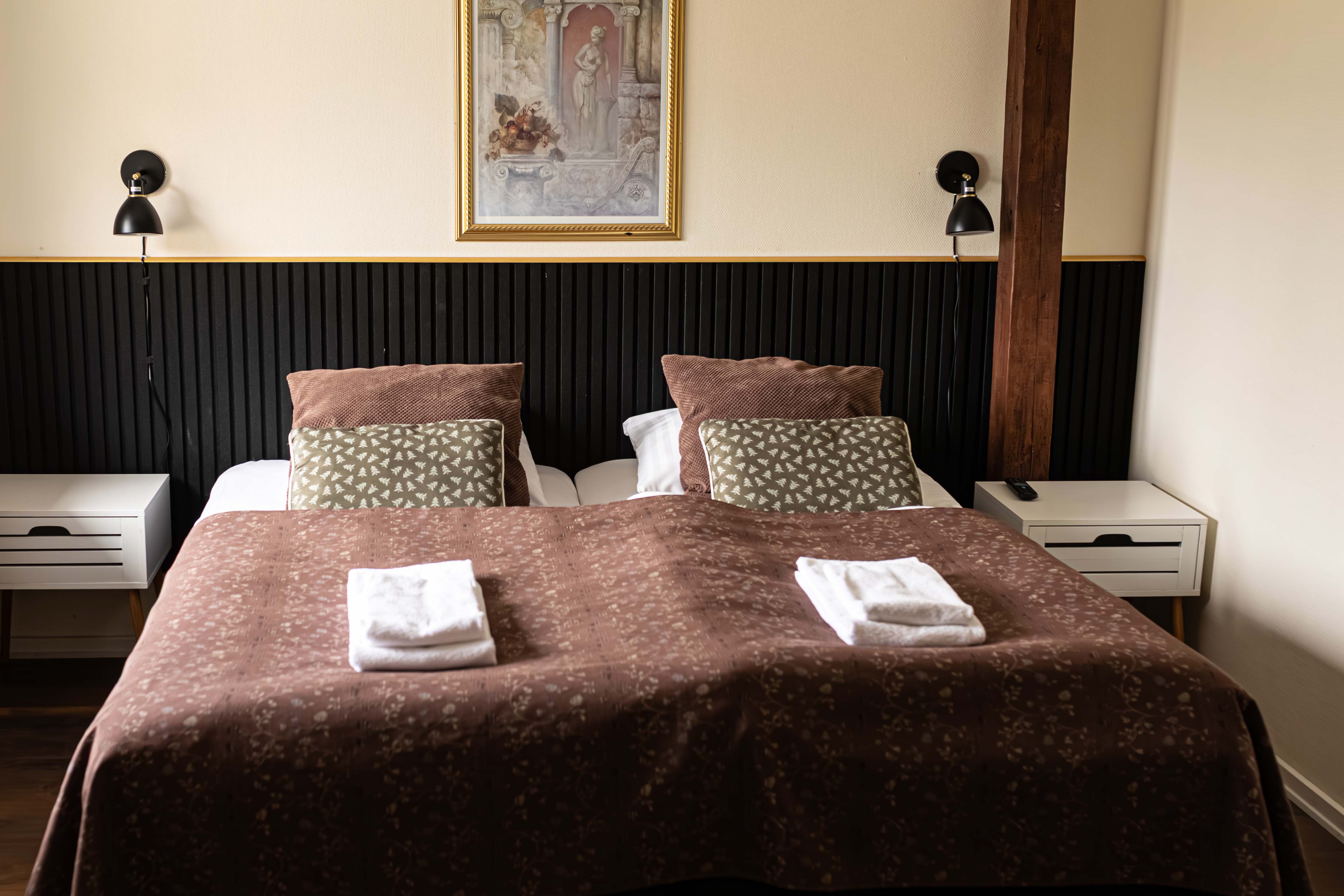 Rundt om Frøslev Kro er der højt til loftet, hvilket I ved selvsyn kan se fra jeres værelse, hvorfra der er udsigt til marker og træer. Indenfor har I naturligvis de faciliteter på værelset, der skal til, for at I får et godt ophold.