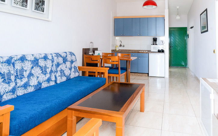 I bor i en 2-værelses lejlighed med soveværelse og et rum til køkken/stue og opholdrum, hvor der kan redes op på sovesofaen. Der er køkken med de nødvendige ting som mikroovn, brødrister, elkedel, kaffemaskine samt engangskøkkensæt, klud, sæbe og køkkensvamp. Derudover er de indrettet med tv og badeværelse med bruser samt safebox (mod gebyr, 12 € pr. uge). Til værelserne er der en altan/balkon med udsigt/skrå udsigt til havet.