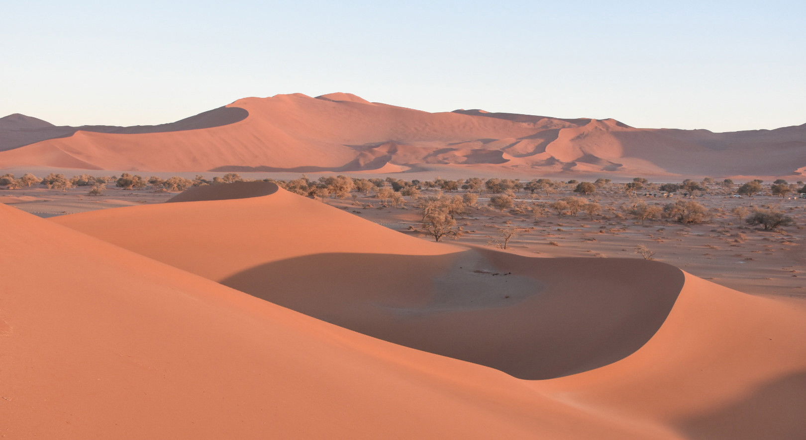 I er slet ikke færdige med Namib ørkenen, og I vandrer ca. 5 kilometer mod sandbankerne ved Sossusvlei og Deadvlei. Mod betaling kan man dog blive kørt. Begge disse ”vleis” er udtørrede søer, der er omkranset af store sandklitter.