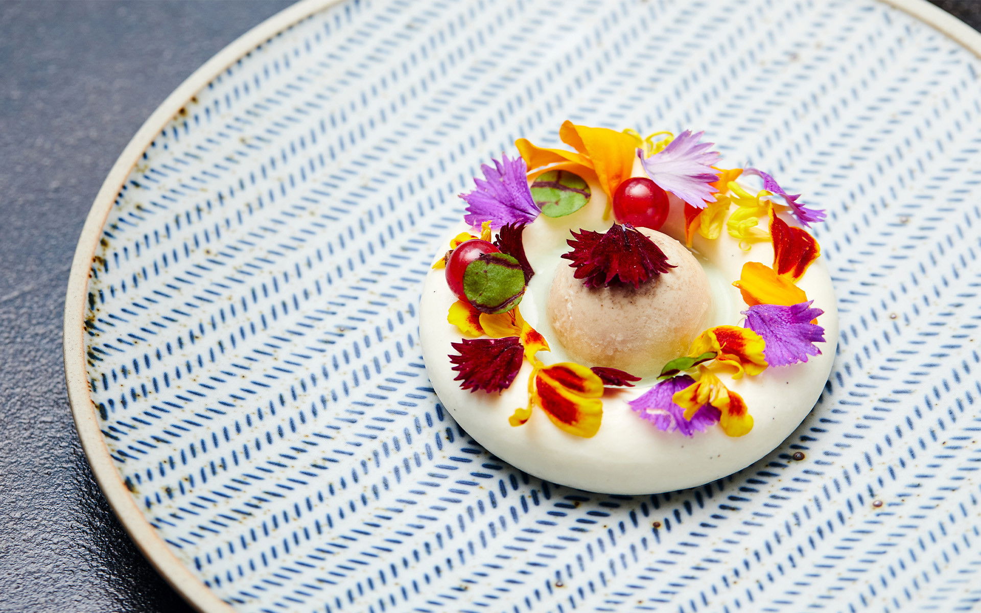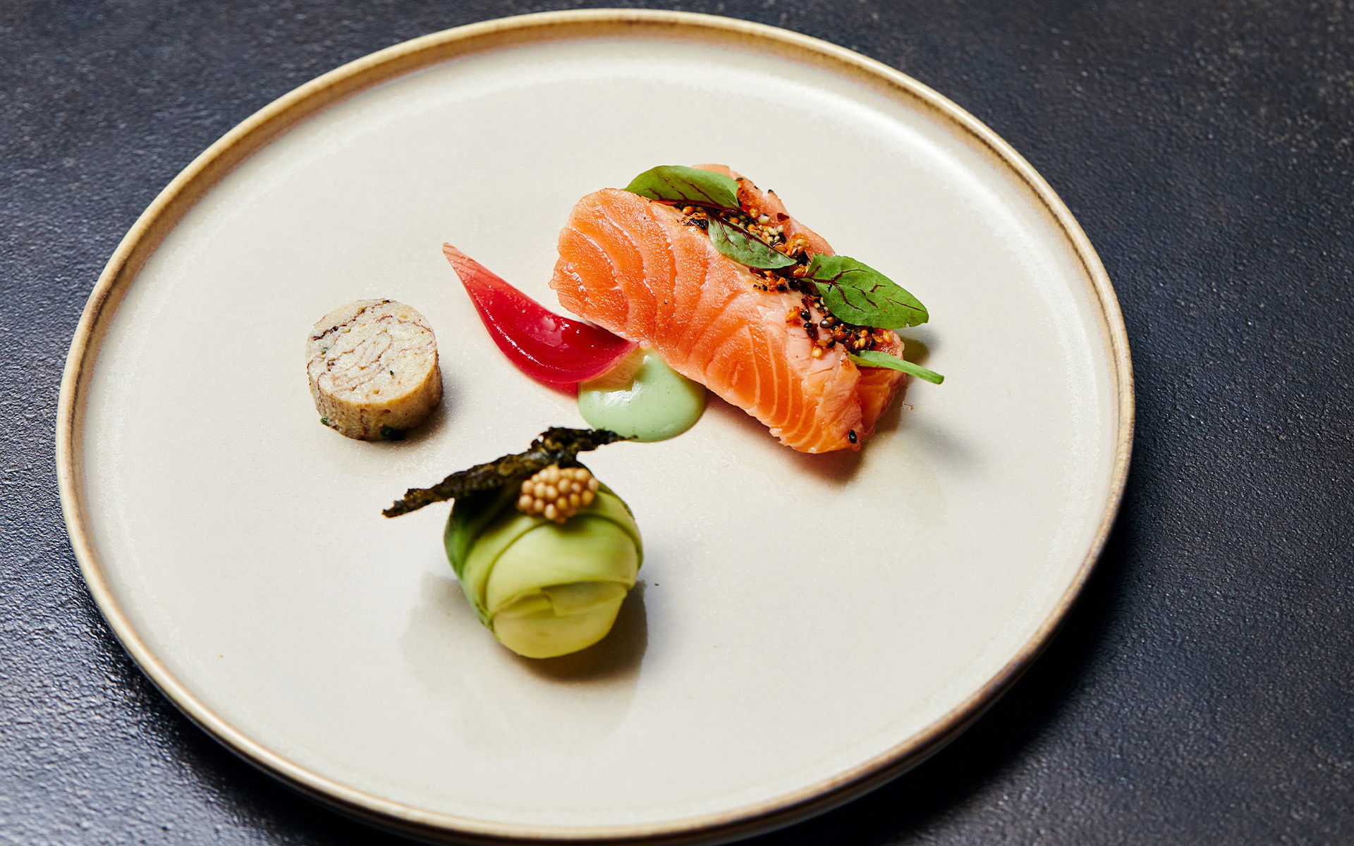 Menuen er tilpasset sæsonens råvarer og sammensættes på dagen af køkkenchefen. Menuen kan derfor variere, men den kunne for eksempel være sammensat på følgende måde:
